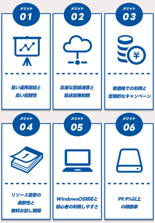 WindowsOSに対応したプランや独自ドメイン取得サービスがあり、初心者でも手軽に利用開始できます。また、99.9%以上の稼働率を保証しているため、安定したサービスを求めるユーザーにも適しています。